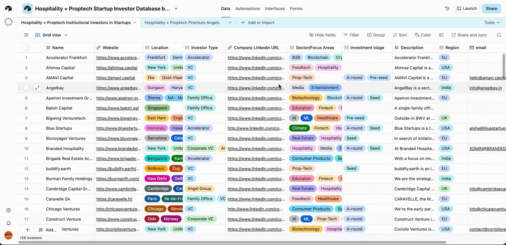 Data includes location, website, description, investment domains, LinkedIn company URL, and contact email. - 438 active angels with premium/open LinkedIn accounts.