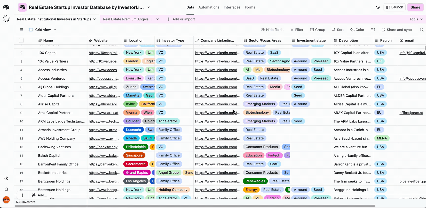 - 533 institutional investors: including VCs, family offices, and angel groups.